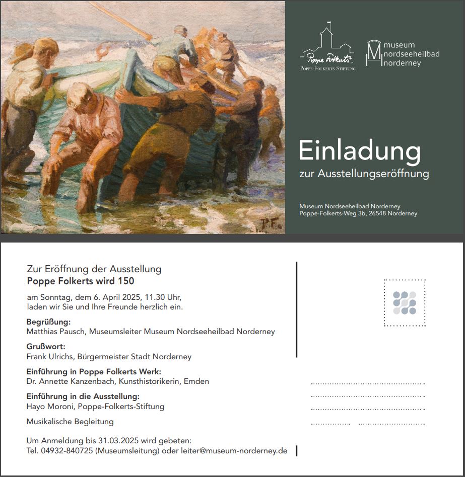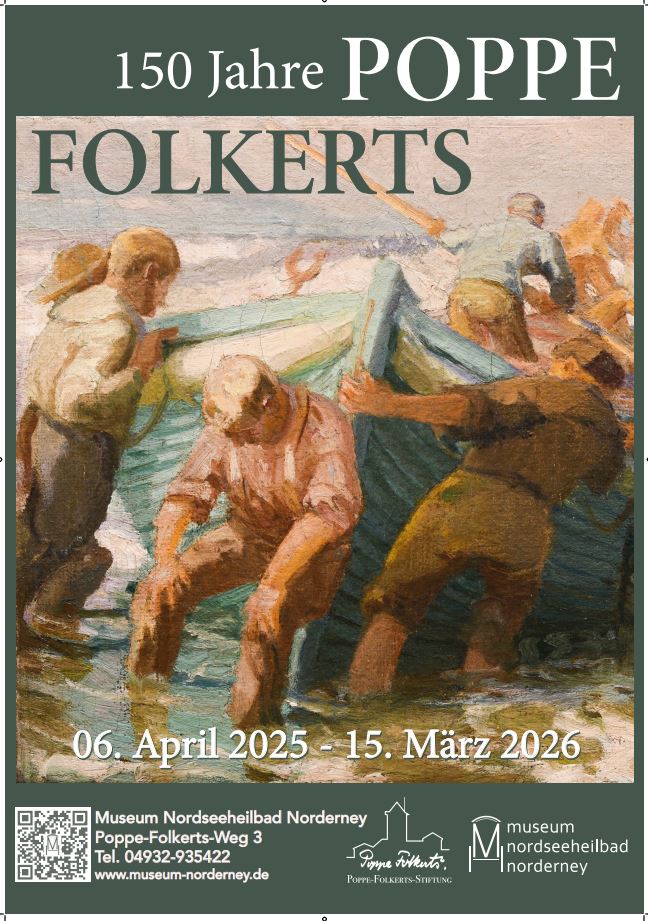 Dazu möchten wir Ihnen anbieten, an dem Tag bereits um 15.00 Uhr an einer Führung durch die große Ausstellung aus Anlaß des 150. Geburtstag von Poppe Folkerts teilzunehmen. In ihr werden in den Räumen des Bademuseums über 120 Werke des bekannten Norderneyer See- und Landschaftsmalers vom 06. April d.J. bis zum 15. März 2026 präsentiert.
