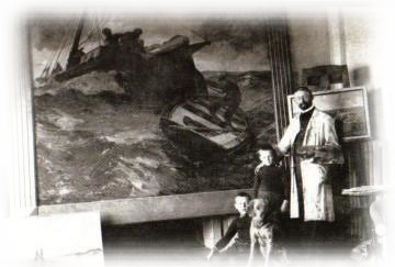 Poppe Folkerts vor seinem Gemälde "Letzte Zuflucht" in seinem Atelier in Kiel-Möltenort, 1904.